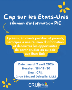 Lors de cette réunion organisée dans les locaux du CRIJ Hauts-de-France à Lille, l’association PIE présentera les différenrts programmes dédiés aux jeunes souhaitant partir aux États-Unis ou dans d’autres pays.